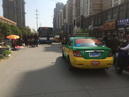 圖二:從小區(qū)出來(lái)的車輛小心地避讓攤位