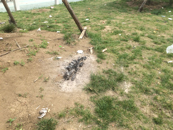 除了這些成品的包裝盒、包裝袋以外,在山南中央公園里還有燒烤遺留下的物品。在靠近沙灘的草地上,淮河早報(bào)、淮南網(wǎng)記者看到多處草地上散落著竹簽、酒瓶和碎骨頭等,明顯是燒烤后留下的,而在一棵樹(shù)旁還有遺留下沒(méi)有燒完的木炭,周?chē)牟莸匾呀?jīng)是光禿禿的了。在這片草地上,淮河早報(bào)、淮南網(wǎng)記者大概地?cái)?shù)了數(shù),有近10處燒烤點(diǎn)。