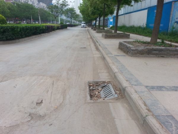 圖三:朝陽中路龍湖中學對面非機動車道邊一處堵塞的雨水井