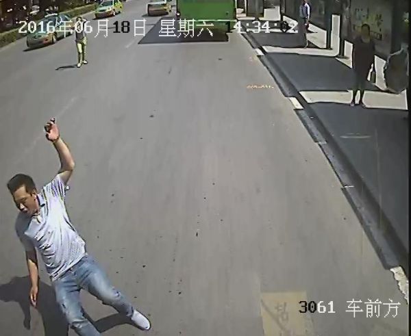 公交車車載監(jiān)控記錄下了當(dāng)時(shí)驚險(xiǎn)的一幕;春釉鐖(bào)、淮南網(wǎng)記者通過監(jiān)控視頻看到,18日下午2時(shí)33分許,26路公交車從北向南正常行駛在龍湖南路,快靠近舜耕公交站時(shí),開始減速行駛。2時(shí)34分,只見車前方有一名男子從路邊朝公交車方向飛奔而來,后面還有一名女子也在跑,然后該男子就倒在了車下;春釉鐖(bào)、淮南網(wǎng)記者注意到,該男子從路邊跑來,到駕駛員剎車,僅僅用時(shí)3秒鐘。