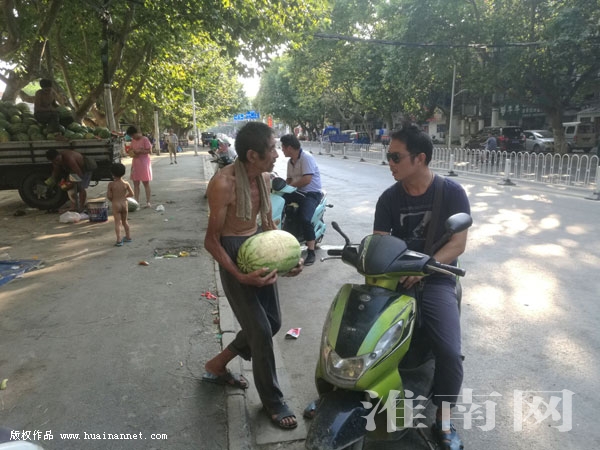 “這邊的西瓜多少錢一斤?”一位騎著電動車,戴著墨鏡的男子來到西瓜攤點前,得知價格后,讓老人挑了兩個最大的。該男子介紹,他在朋友圈里看到轉(zhuǎn)發(fā)的“爺孫賣瓜”的事情,又看到《淮河早報》的報道后,特地過來看看買點西瓜。