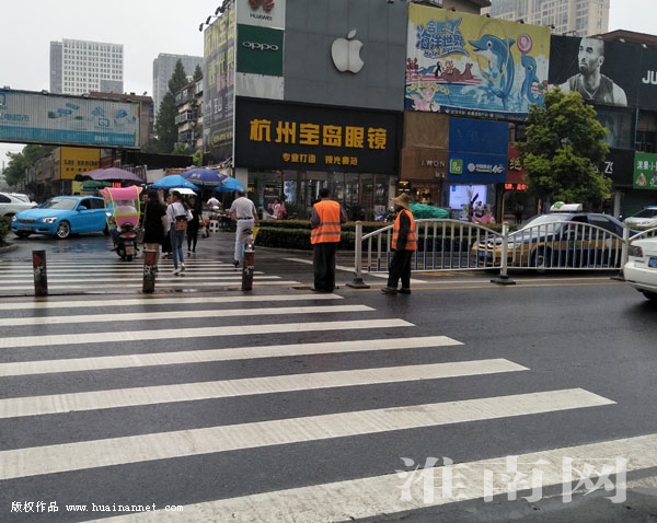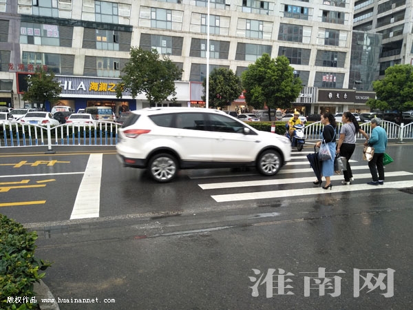 9月10日是周末,雖然下著雨,但龍湖路上依然有不少市民逛街,下午3時30分至4時30分,淮河早報、淮南網(wǎng)記者一直在龍湖路商之都門口的斑馬線上觀察。