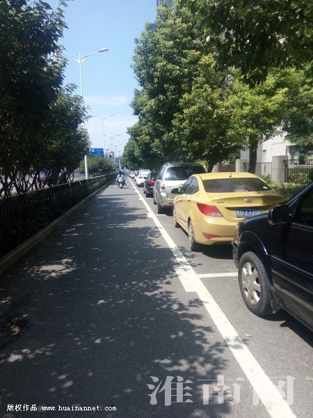 圖:淮河大道東邊人行道上的機(jī)動車有序地停在線內(nèi)(記者)